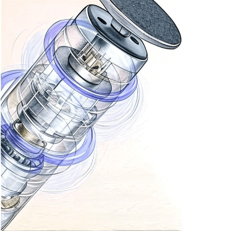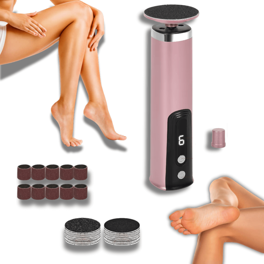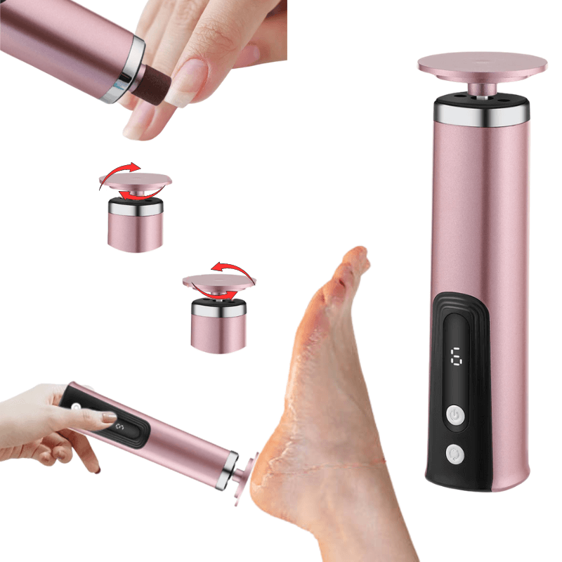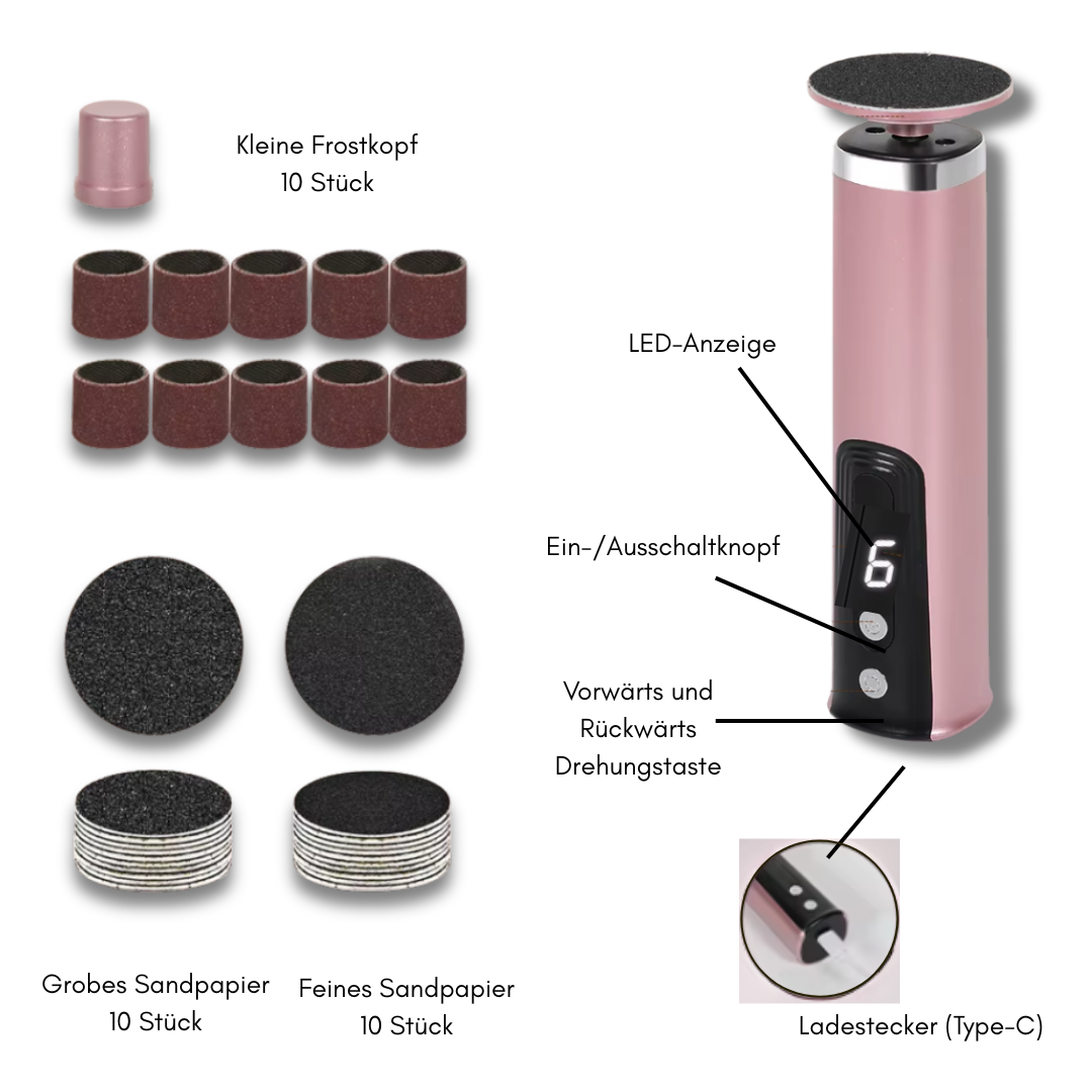 Begleiter für professionelle Fußpflege zu Hause oder unterwegs. Dieses innovative 2-in-1-Gerät kombiniert kraftvolle Hornhautentfernung mit präzisem Nagelpolieren und sorgt für weiche, gepflegte Füße und